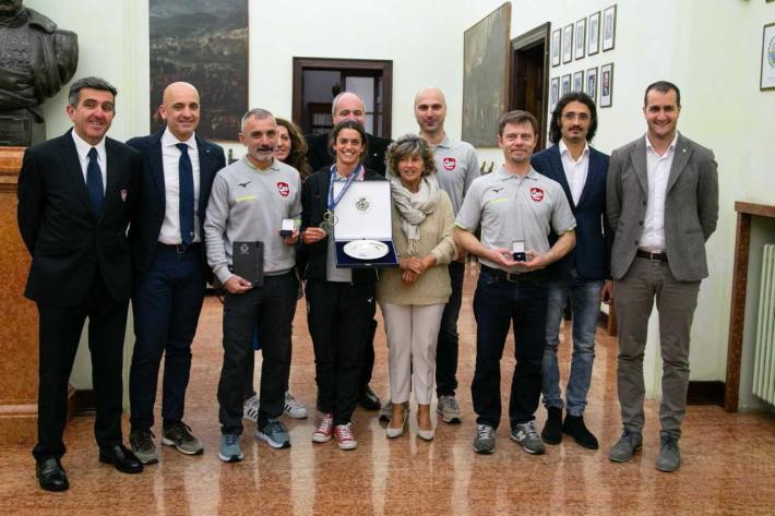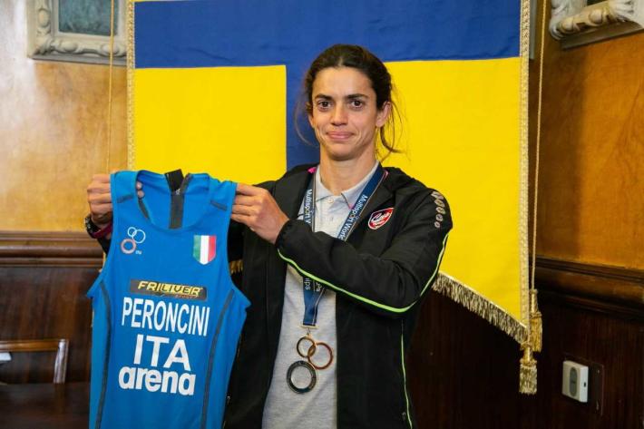 Si conclude con il ricevimento ufficiale in Municipio, nella Sala di Rappresentanza, da parte di Marco Bosi, Vicesindaco del Comune di Parma, con delega allo Sport, l’impresa di Eleonora Peroncini. Al momento hanno preso parte Rossano Rinaldi consigliere CUS Parma; Luigi Passerini, responsabile sezione e segretario CUS Parma; Giuseppe Posillipo, allenatore di nuoto; Corrado Morini, responsabile allenatore ed allenatore di Eleonora; Fabrizio Faelli,preparatore atletico. Il vicesindaco, Marco Bosi, ha donato un piatto ad Eleonora Peroncini e tredistintivi (pin) con lo stemma del Comune di Parma ai tre allenatori: Posillipo, Morini e Faelli. Il vicesindaco, Marco Bosi, con delega allo sport, ha parlato di Eleonora come di un esempio, sopratutto per le giovani generazioni. “Ringrazio Eleonora – ha sottolineato – per aver portato Parma e l'Italia nel mondo, con una disciplina, il Triathlon, che è in crescita. Si tratta di uno sport di fatica, in cui non è possibile improvvisare ma sono necessari costanza, impegno e tanta passione. E' questo un messaggio importante sopratutto per le giovani generazioni in quanto Eleonora ha raccolto i frutti di un impegno costante”. Eleonora Perocini ha spiegato che si tratta di un risultato importante e, per certi versi inaspettato. “Questa medaglia non è solo mia – ha sottolineato – ma del team e degli allenatori che mi hanno preparata”. Rossano Rinaldi, consigliere CUS Parma, ha portato i saluti del presidente Michele Ventura ed ha sottolineato come “sia un onore per la società avere un atleta come Eleonora che ha portato a casa un prestigioso risultato grazie al suo impegno costante”. L’atleta parmigiana ha conquistato il podio più alto, indossando i colori del CUS Parma Triathlon Parmigiano Reggiano, con una prova superlativa, dopo che lo scorso anno aveva già conquistato la medaglia di bronzo. La nuova campionessa mondiale di Triathlon Cross, ha ricevuto gli onori e i complimenti della sua città con un momento ufficiale in cui ha spiegato in forma pubblica l’impresa agonistica che l’ha vista primeggiare tra 47 atleti impegnati nella rassegna mondiale. Eleonora ha gareggiato nella categoria Elite al Mundial di Pontevedra (Spagna) in una competizione iniziata lo scorso 27 aprile, dove in otto giorni sono stati assegnati i titoli iridati di duathlon (distanza sprint e standard), triathlon cross, aquathlon, triathlon long distance e aquabike. Ha regalato una gara straordinaria al pubblico e ai tifosi italiani, una gara che li ha tenuti con il fiato sospeso, poiché la vittoria è arrivata dopo che l’atleta era uscita dalla frazione natatoria in 12esima posizione. Eleonora, come nelle favole più belle, che a volte lo sport regala, ha saputo rimontare lungo la dura frazione Mtb fino ad entrare in T2 in prima posizione con un vantaggio di circa 30” sulle immediate inseguitrici. Nella fase finale, la Peroncini ha saputo contenere il rientro delle avversarie ed arrivare ad incrementare addirittura il suo vantaggio. Un’avventura di sport e determinazione che viene restituita, con questo incontro, alla sua città. Un momento in cui Parma vuole dimostrarle l’orgoglio e renderle l’onore di averla tra le sue atlete.