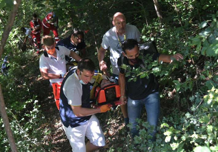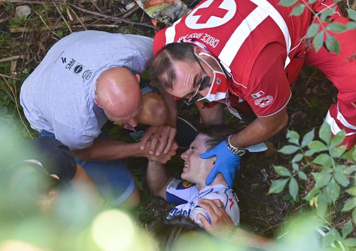 «Voglio tranquillizzare tutti, Remco è sempre stato vigile, ora lo stanno portando in ospedale e vediamo. Ma ci tengo a tranquillizzare tutti». Il direttore sportivo alla Quick Step, Davide Bramati, la squadra del belga Evenepoel, rassicura ai microfoni della Rai sulle condizioni del corridore. Buone notizie anche dal sito del 118 che dà il corridore soccorso in codice giallo. «Remco - aggiunge Alessandro Tregner, responsabile della comunicazione della Deceuninck Quick Step - ha riportato un forte trauma alla gamba destra, non ha mai perso lucidità ed ha sempre risposto alle domande del dottor Massimo Branca che lo ha soccorso. Ovviamente è stato imbragato per precauzione e per essere riportato sulla sede stradale».