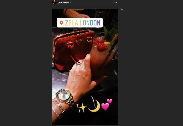 La stessa Georgina ha pubblicato una storia su Instagram che mostra la sua mano sinistra, con l’elegante anello tempestato di pietre preziose, che impugna un bicchiere con un cocktail allo Zela London di cui lo stesso Ronaldo è uno dei finanziatori.