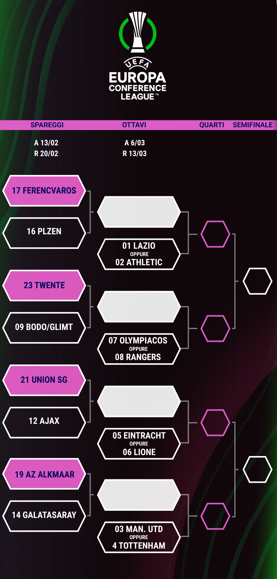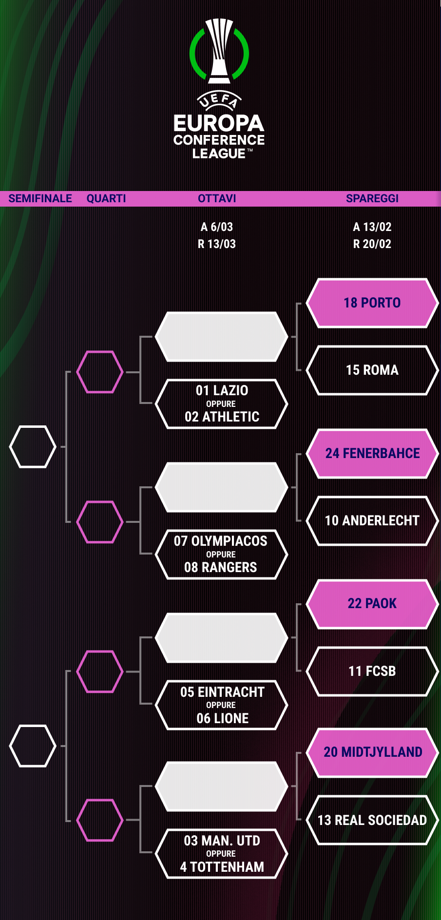 OTTAVI (and. 4/5 marzo, rit. 11/12 marzo) 1) vincente a - Liverpool/Barcellona 2) vincente b - Lille/Aston Villa 3) vincente c - Atletico Madrid/Bayer Leverkusen 4) vincente d - Arsenal/Inter 5) vincente e - Barcellona/Liverpool 6) vincente f - Aston Villa/Lille 7) vincente g - Bayer Leverkusen/Atletico Madrid 8) vincente h - Inter/Arsenal
