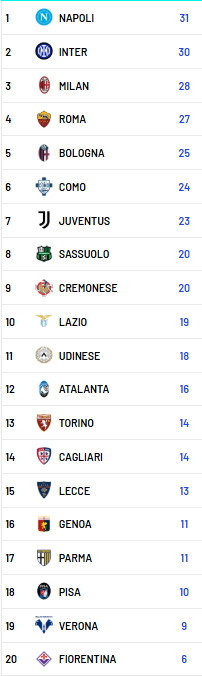 Nonostante il Napoli approcci con decisione anche il secondo tempo, alla Juventus basta una fiammata per segnare la rete dell’1-1. Su azione di ripartenza al 59', McKennie imbuca per Yildiz che solo davanti a Milinkovic pareggia i conti. Gli ospiti prendono fiducia e la partita diventa più equilibrata. Il Napoli però non demorde e riesce a tornare in vantaggio, sfruttando un clamoroso errore di McKennie. Al 78', su traversone di Neres, il centrocampista americano intercetta di testa, ma serve un assist involontario per Hojlund che, da due passi, buca Di Gregorio e segna il 2-1. L’assalto finale dei bianconeri produce solo un tiro centrale di Zhegrova al 94', bloccato senza problemi da Milinkovic-Savic. Con questo successo il Napoli scavalca l’Inter e torna al primo posto della classifica di Serie A, a quota 31. Per la Juve, invece, arriva la settima sconfitta consecutiva al Maradona: bianconeri fermi al settimo posto.