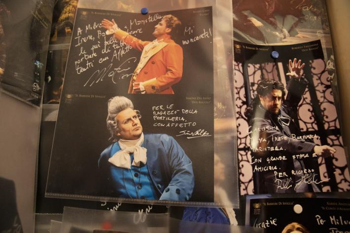 Sono queste signore - se necessario, supportate delle “maschere” (il personale di sala) - i numi tutelari dei camerini. Nulla avviene a caso: il numero uno è quello, di rappresentanza, assegnato al direttore d'orchestra. Il tre è del basso (Michele Pertusi ci è affezionato); il quattro del tenore; il cinque del baritono (Leo Nucci lo conosce come le proprie tasche); il sei è del soprano e fu “abitato” anche da Maria Callas, neanche trentenne, nella «Traviata» del 1951.