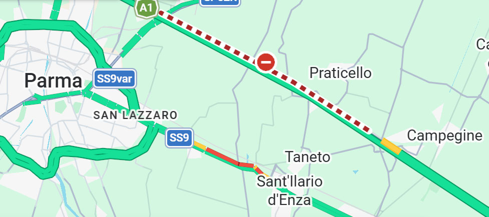 In A1 è chiuso per lavori il tratto fra Terre di Canossa-Campegine e Parma verso Milano. La chiusura notturna durerà fino alle ore 5 del mattino di mercoledì 1° aprile. Il traffico è deviato sulla via Emilia. L'entrata consigliata per viaggiare verso Milano è quella di Parma.