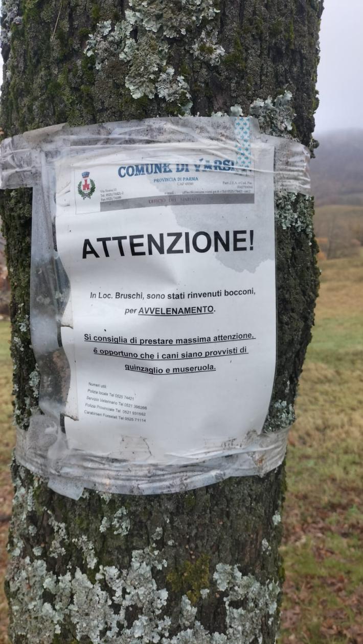 Resta ancora l'allarme bocconi avvelenati nel comune di Varsi, nello specifico in località Bruschi, cartelli messi a marzo ma ancora presenti: sopralluoghi della polizia locale e dei carabinieri forestali. Sono stati affissi dei cartelli che avvisano la popolazione, consigliando di tenere i cani al guinzaglio e con la museruola.