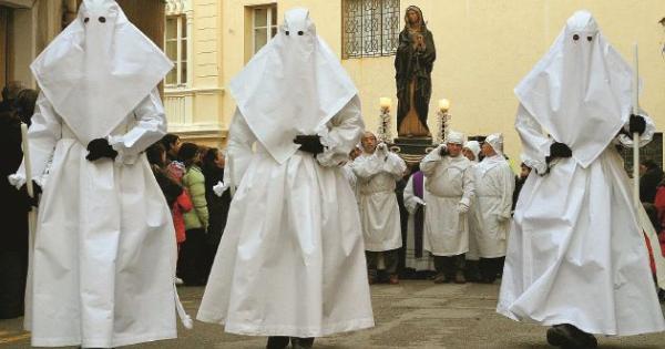 Tutto ha inizio con la «professione», l'antichissima cerimonia che si svolge il venerdì prima della Domenica delle Palme. In quel momento, con medievale austerità sotto gli archi della chiesa di San Michele, chi entra nella confraternita (che d'ora in poi sarà chiamato «germano» dallo spagnolo hermano, che significa, appunto, fratello) pronuncia la formula solenne e e si affida all’Addolorata prima di indossare un abito bianco ornato di fiocchi neri e con il cappuccio che copre il viso. Guardateli e confrontate con quello che accade in Spagna: le somiglianze sono tante.