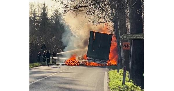 Autotreno in fiamme a Stradella di Collecchio: l'incendio si è scatenato dopo le 15,30 in via Spezia. I vigili del fuoco stanno intervenendo in questi istanti. Il rogo molto vasto ha messo a rischio anche le piante al lato della strada. Il video è del lettore Roberto Ruggero. Foto di Luca Bertozzi