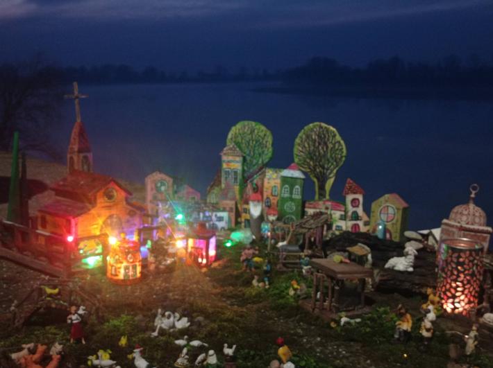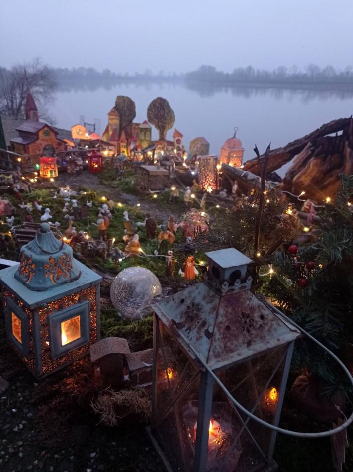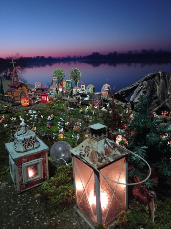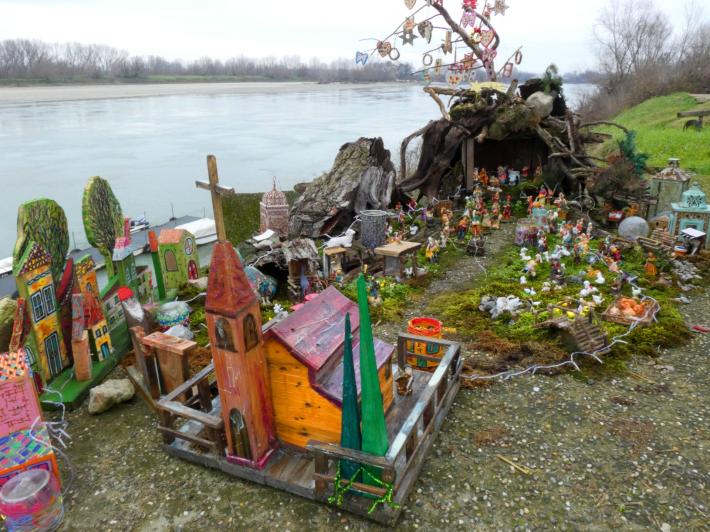 E a Roccabianca una vera e propria meraviglia in riva al Grande fiume, e per il fiume. E’ il presepio realizzato a Stagno di Roccabianca dal Gruppo Tramonto. Una idea nata alcuni fa, quasi per caso, da un gruppo di persone solite a ritrovarsi ogni giorno, quando si fa sera, sul Po. L’idea ha preso piede e vigore ed il presepio si sta facendo sempre più grande. Ai realizzatori storici, Antonietta Bergamaschi, Ilaria e Lucia Migliorati, Giorgio Bianchi e Angelo Gil Balocchi si sono aggiunti e si stanno tuttora aggiungendo altre persone che spesso portano e donano un pezzo, una statua piuttosto che una radice, rendendo questa opera d’arte sempre più bella, più grande e di richiamo per un numero crescente di visitatori dal’una e dall’altra riva del Po.